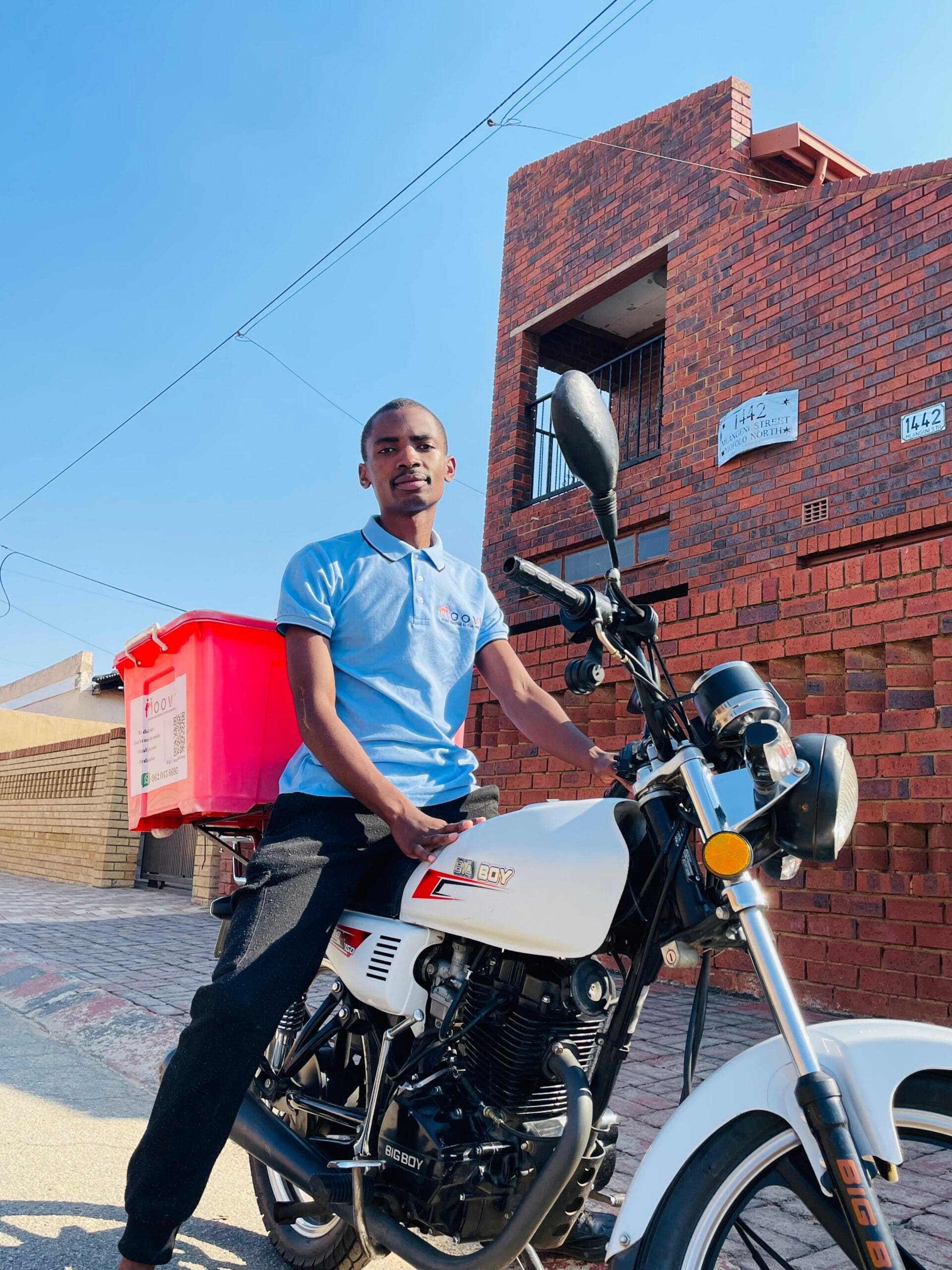“Working with Moovy has changed my life. I didn’t have a formal job before, and now I earn an income, learn about logistics and improve my customer service skills. Every delivery I make supports local shops and families in the community,” Motsamai said.